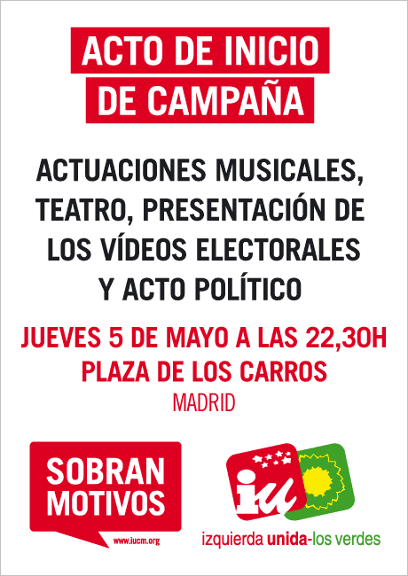 Os adjuntamos el cartel del inicio de la campaña electoral de IU-CM. Será este jueves 5 de mayo de 2011, a partir de las 22:30 horas, en la Plaza de los Carros (junto a la Plaza de la Cebada, distrito Centro).Artículo de www.profesionalespcm.org insertado por: El administrador web - Fecha: 05/05/2011 - Modificar