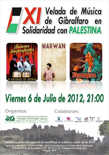 tendrá lugar la XI Velada en Solidaridad con Palestina, en el Castillo de Gibralfaro. En esta ocasión contaremos de nuevo con la actuación del Cantautor hispano-palestino Marwan, y los grupos malagueños Pangea y Boleros Imperfectos. Como en años anteriores, los beneficios de la Velada
