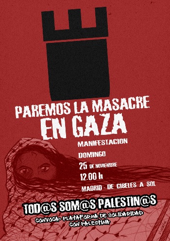 Secciones: Convocatorias - PalestinaTítulo: 25/11/12 - Manifestación TODOS SOMOS PALESTIN@S: Madrid a las 12h de Cibeles a Sol - ¡PAREMOS LA MASACRE EN GAZA!- Enlace 1 Texto del artículo: