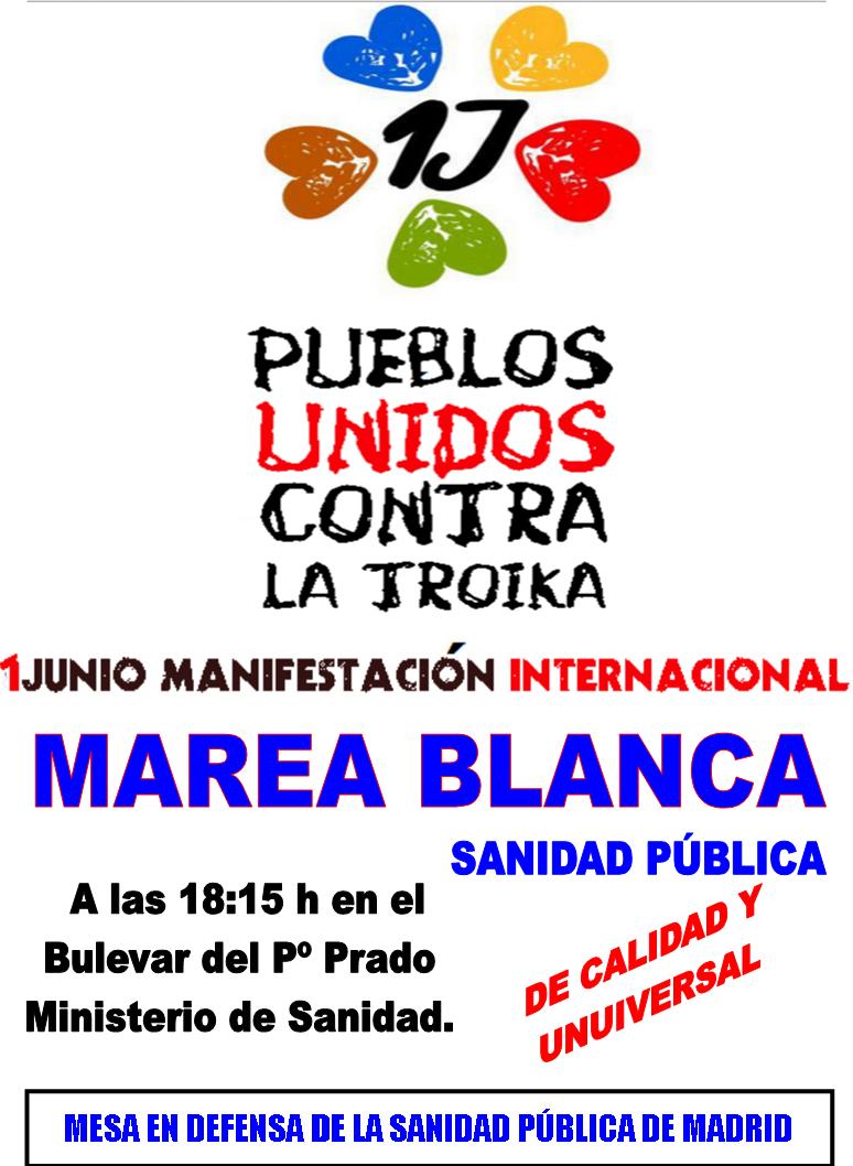 Bajo el lema ‘Pueblos unidos contra la troika’, la Marea Ciudadana (colectivo que organizó la manifestación del 23F en Madrid y en el que se integran el 15M, Ecologistas en Acción, la PAH, la Marea Blanca y la Verde, así como otras organizaciones sociales) pretende ‘tomar’ las calles de toda Europa contra los recortes impuestos para cumplir con los requisitos del Memorándum de Entendimiento del rescate bancario, unas medidas que califican de