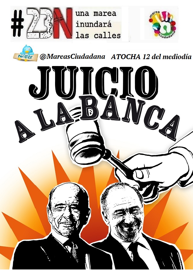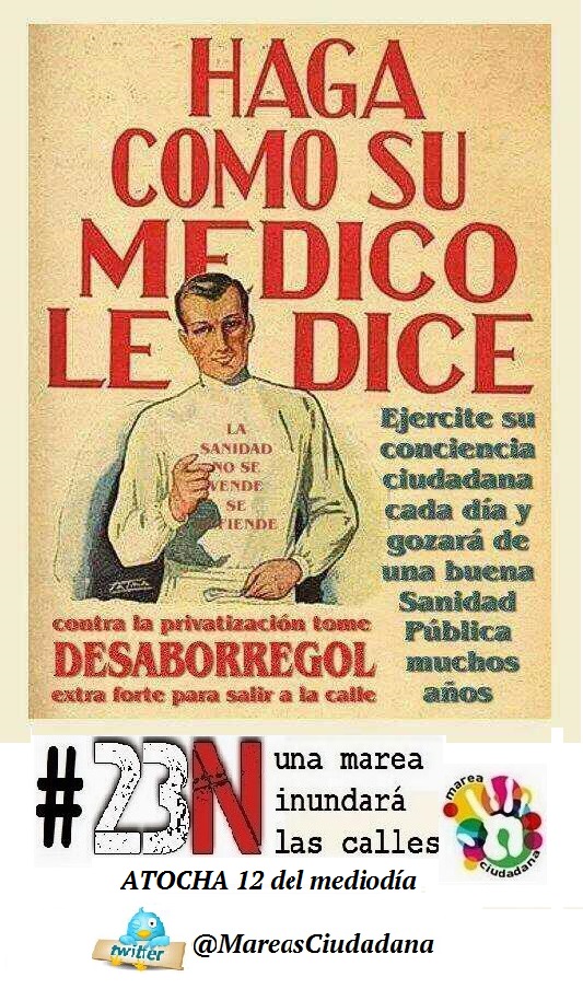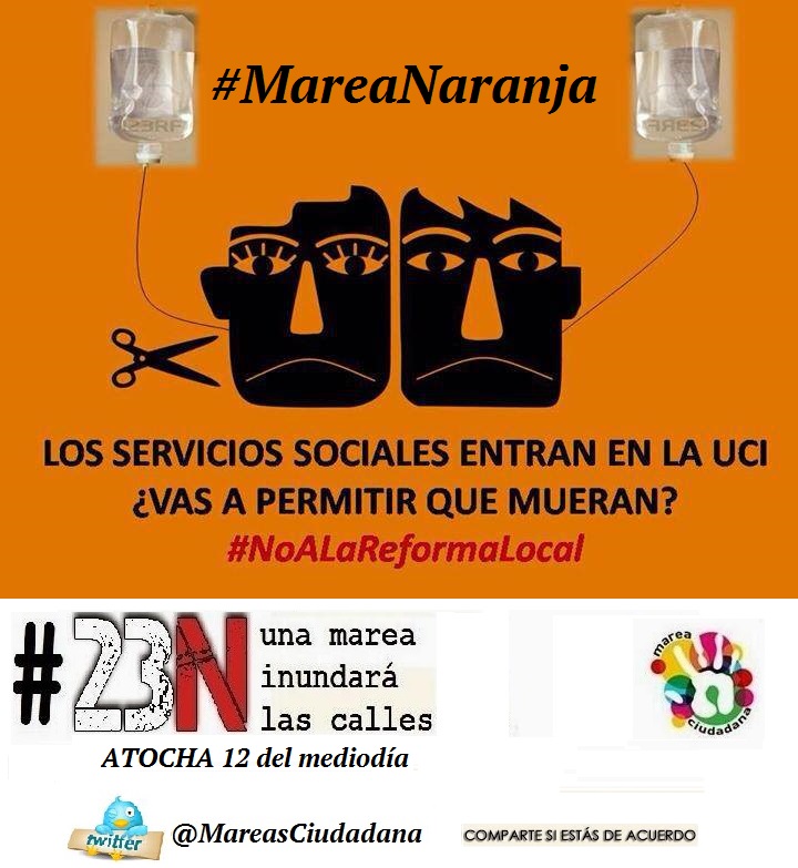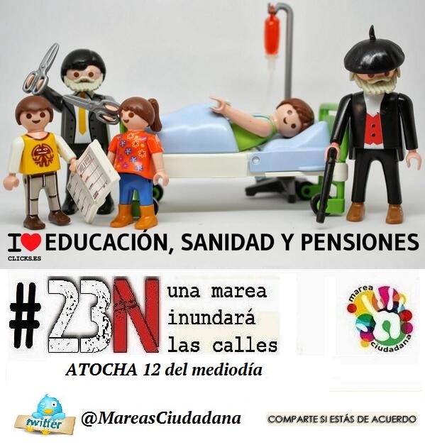 Este 23N tiene que servir para relanzar una necesaria movilización permanente y unitaria para acabar con la reforma laboral, la reforma de las pensiones, los recortes y la privatización de los servicios públicos y sociales, incluida la sanidad, la educación y la dependencia, la ley Wert, con el copago sanitario, con la privatización de la justicia, con los recortes de derechos fundamentales como el de manifestación y huelga, con la especulación y los desahucios, con el robo de competencias municipales, con la subvención a fondo perdido del capital y de la banca … Con esta monarquía bipartidista y sus políticas de derechas, y con el gobierno que las aplica.