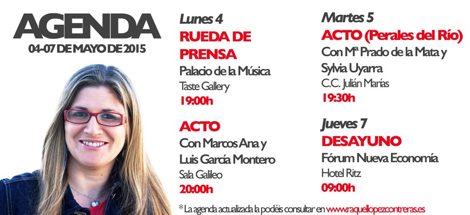Secciones: Convocatorias - Documentos militante IU/ PCE - 15M, SUMAR, mareas, unidad popular, PAHTítulo: Agenda Semanal del 04-07 de mayo de 2015 de RAQUEL LOPEZ, candidata de IU-CM a la alcaldía de Madrid- Enlace 1 - Enlace 2 Texto del artículo: