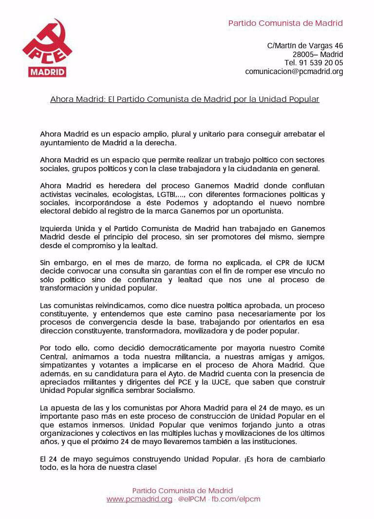 Secciones: Documentos militante IU/ PCE - 15M, SUMAR, mareas, unidad popular, PAH - El Problema EspañolTítulo: #ComunistasPorLaUnidad, campaña de apoyo del PCM a Ahora Madrid. - Enlace 2 Texto del artículo: