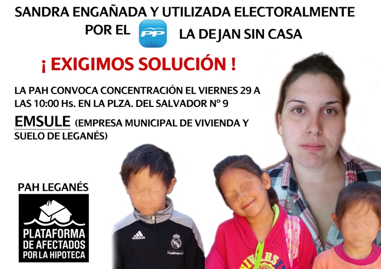 Secciones: Convocatorias - 15M, SUMAR, mareas, unidad popular, PAHTítulo: Concentración en apoyo a Sandra (PAH) el viernes 29/5/15 en Leganés Texto del artículo: