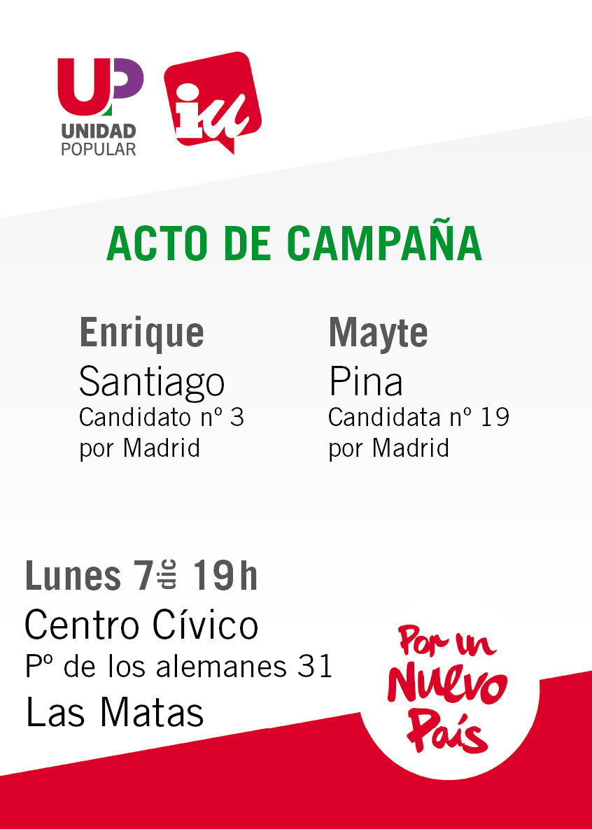 Comenzamos la campaña con fuerza, tenemos programado un acto en Las Matas en el que te invitamos a acudir y a traer a tus vecinos/as y amigos/as: Será el próximo lunes día 7 a las 19h en el Centro Cívico de Las Matas (Pº de los alemanes nº 31). Presentaremos a Enrique Santiago (nº 3 en la candidatura de Madrid) y Mayte Pina (nº 19 en la candidatura de Madrid).
