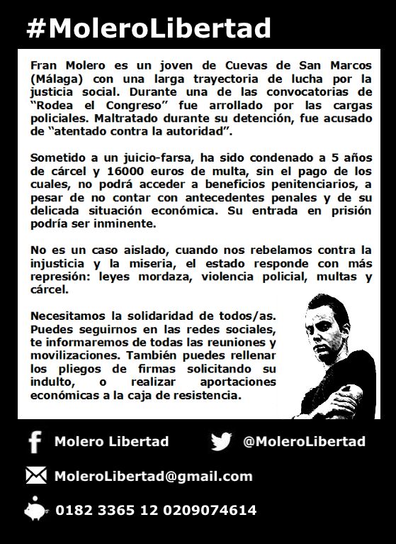 Secciones: 15M, SUMAR, mareas, unidad popular, PAH - El Problema EspañolTítulo: #MoleroLibertad - Libertad para Fran Molero, condenado a 5 años por #asediaelcongreso - Ayuda económica- Enlace 1 - Enlace 2 Texto del artículo: