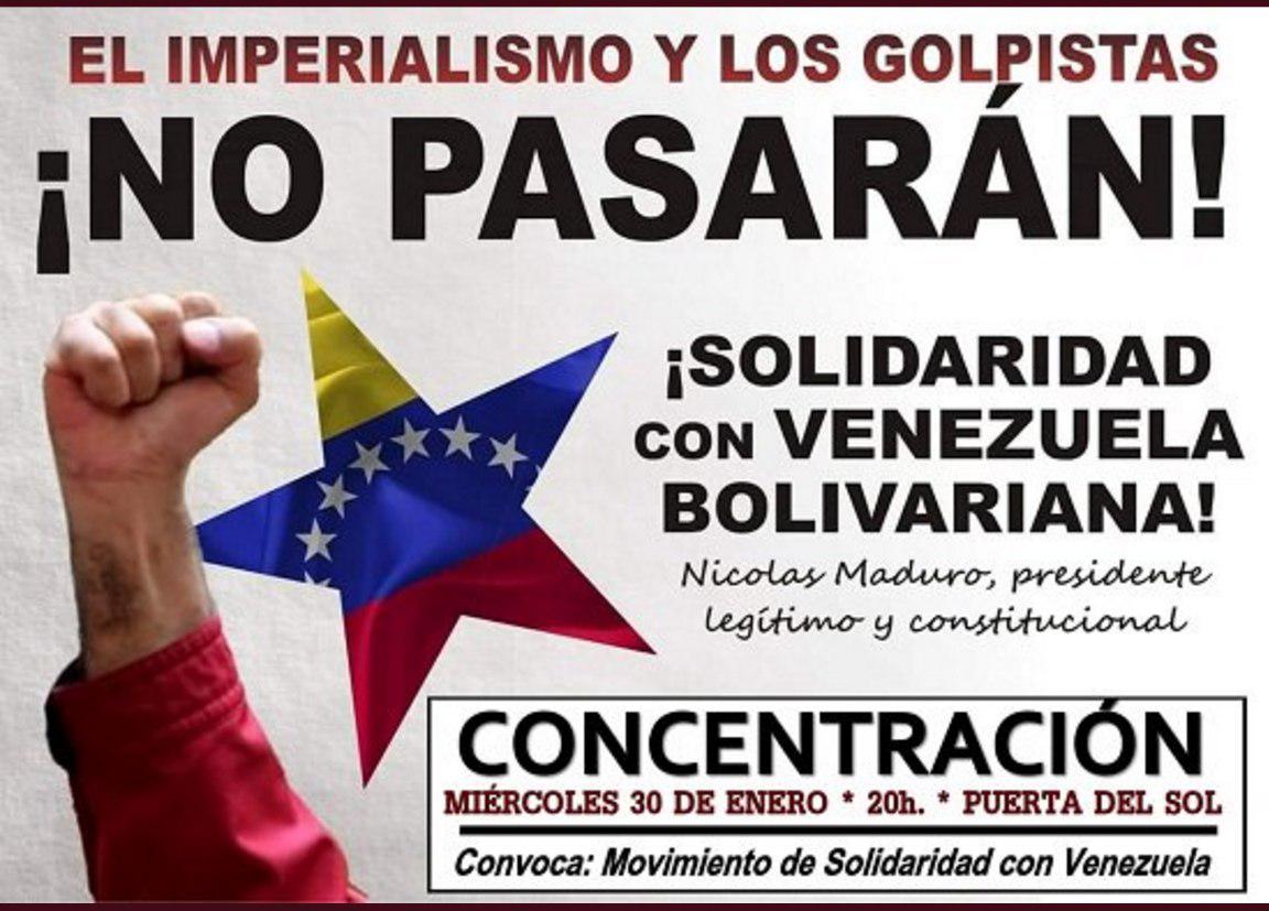 Frente al criminal intento golpista perpetrado por el ejecutivo yanqui y sus gobiernos lacayos, reconociendo como presidente de la República Bolivariana de Venezuela al usurpador Juan Guaido, presidente espurio de la Asamblea Nacional Venezolana fuera de la ley, el Movimiento de Solidaridad con Venezuela de Madrid condenamos rotundamente esta maniobra antidemocrática e imperialista.