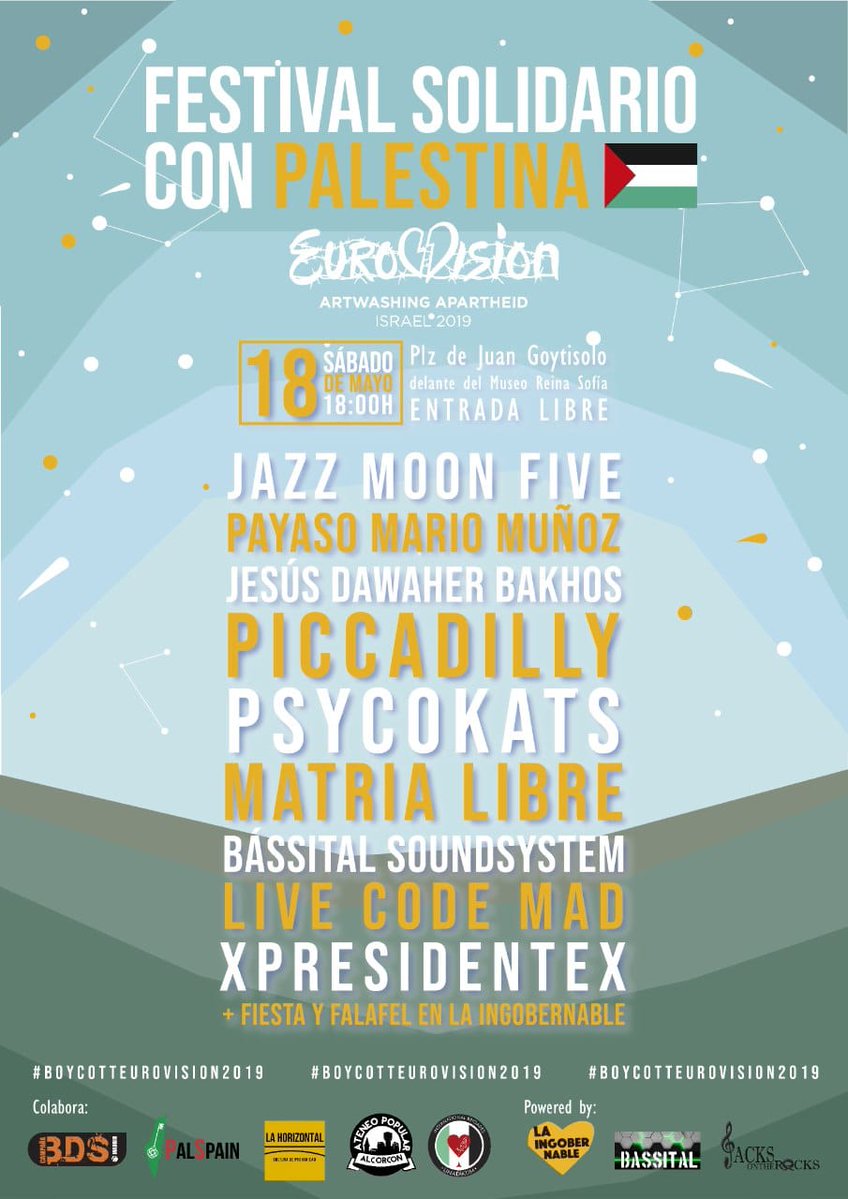 No permitamos que el régimen sionista de #Israel blanquee sus acciones criminales contra el pueblo palestino. Secundamos el boikot a #Eurovision2019? ?El #18deMayo no os perdáis la contragala.