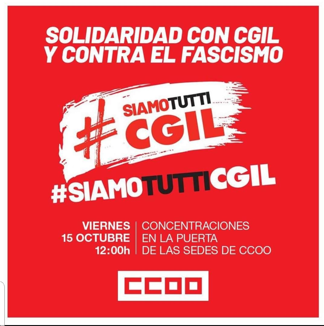 El viernes 15 de octubre a las 12h en todas las sedes de CCOO se realizará una concentración de apoyo y solidaridad con la CGIL y contra el fascismo bajo el lema